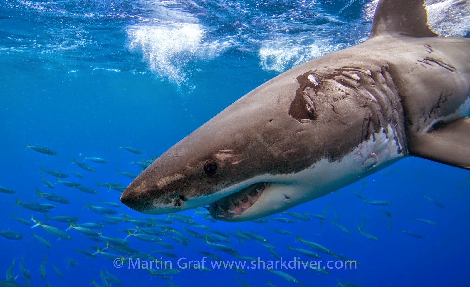 We have seen an unusual number of sharks with fresh bite marks at Guadalupe Island this season. It seems like most sharks, over about 12 ft long have some kind of new bite marks on their bodies. Chugey has another nice bite to his head, a new shark's face is all messed up and Kendric has a big bite on his tail. It seems like Thor and Bite Face are the only large sharks that haven't been bitten.