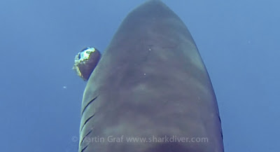 But are sharks really immune to tumors or cancer? Well, since I'm not a scientist, I'm not sure about the cancer part, but I can definitively say that sharks do get tumors. Take "Meli" for example. He's a great white shark who regularly visits Guadalupe Island. Last year we first spotted him with a big growth on his left side and it is still there a year later. These pictures were taken just a couple of weeks ago and show his big tumor.