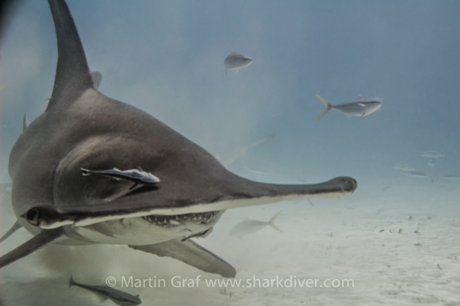 "Hammerhead shark tries to attack diver! A dramatic video has emerged of a hammerhead shark trying to attack a diver in the Bahamas. In the footage, captured during a scuba diving trip in the Bimini Atoll in late January, the shark can be seen circling a diver before lunging forwards several times. Fortunately, the experienced diver was able to push the shark away and survived the experience without any injuries."